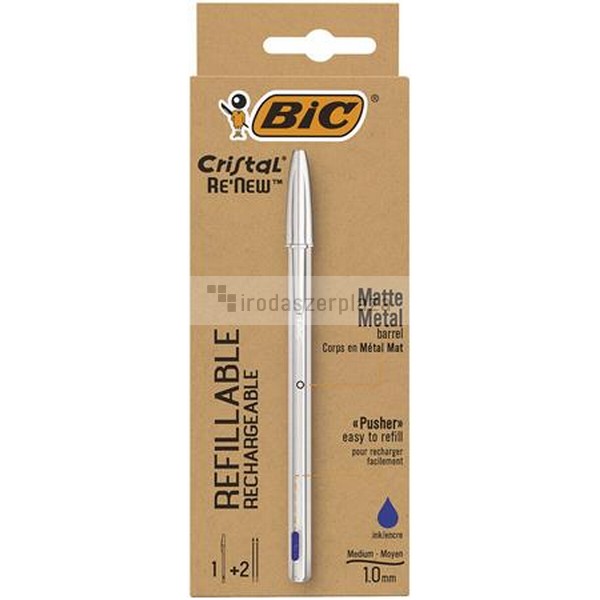 Golyóstoll 0,32 mm, kupakos, matt ezüst színű tolltest, BIC "Cristal Re`New", kék + betét
