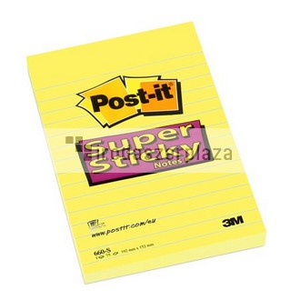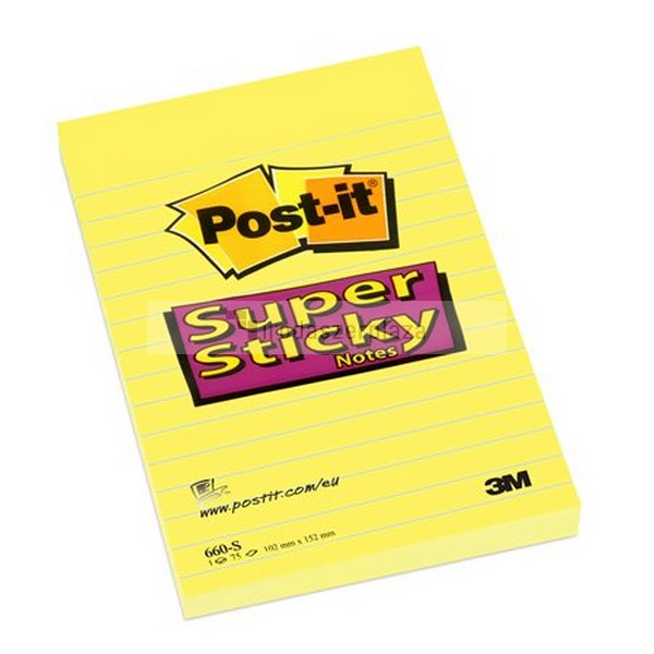 Öntapadó jegyzettömb, 102×152 mm, 90 lap, vonalas, 3M POSTIT „Super Sticky”, sárga