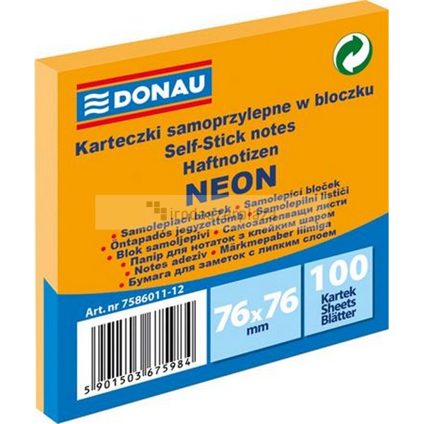 Öntapadó jegyzettömb, 76x76 mm, 100 lap, DONAU, neon narancssárga
